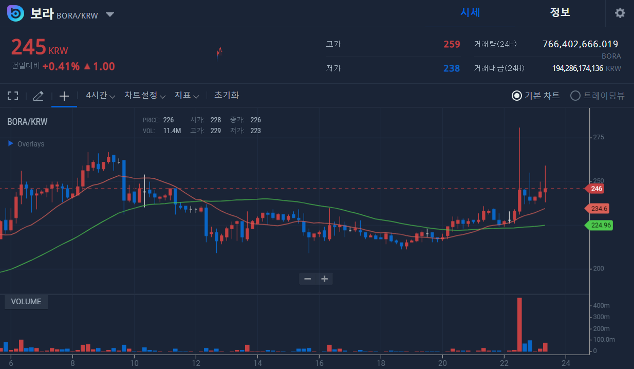 코인 시장이 역사상 가장 뜨거운 시기인 요즘 보라코인이 카카오게임즈의 계열사로 편입 되었다는 소식이 전해지면서 호재 소식을 공한 이후에 급등하는 모습을 보여주고 있습니다. BORA는 Blockchain Orchestrated Redeemable Asset의 줄임말이다. 급등하는 코인에 불타기 조심.